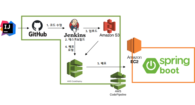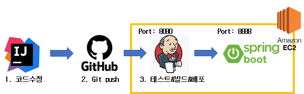 코드 수정 -> git push -> CI동작(테스트 및 빌드-Spring Boot의 경우 보통 Junit test 후 jar 빌드) -> 배포파일 생성!