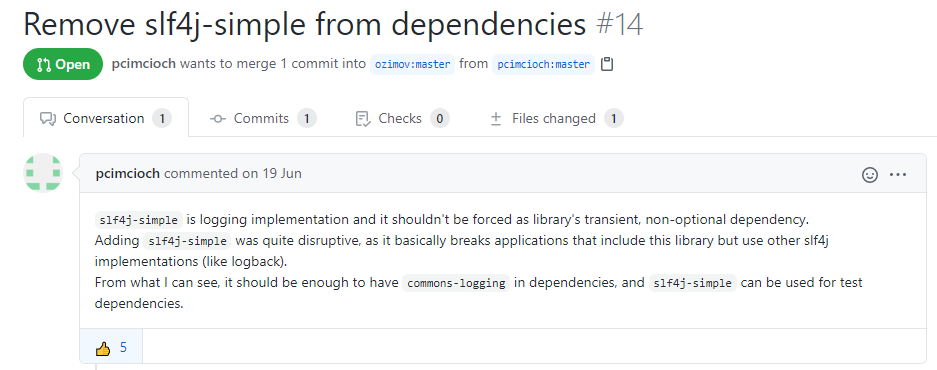 하지만 아직까지 merge되지 않아 0.7.3 버전 사용 시 slf4j가 같이 딸려오므로 컴파일 빌드 시 제외해주어야 한다.